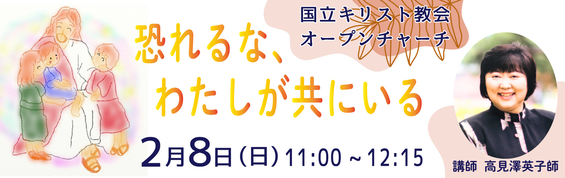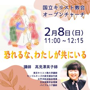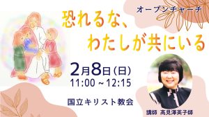 2月8日(日)オープンチャーチのテーマは『恐れるな、わたしが共にいる』です。東京キリスト教大学講師の高見澤英子師が、わかりやすく聖書のお話をしてくださいます。