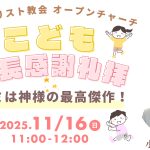 2025年11月15日 / 最終更新日 : 2025年11月15日 kcc@sakuraadmin2025年11月 オープンチャーチ 今回のオープンチャーチは『子ども成長感謝礼拝』です。テーマは「キミは神様の最高傑作!」。子どもの成長を感謝して、神様の祝福をお祈りする礼拝です。国立キリスト教会の小川 真牧師が、わかりやすく聖書のお話をします。